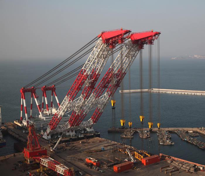 3600噸浮吊作為起重船核心技術(shù)之一,由海西重機(jī)自主研發(fā)、設(shè)計、制造和安裝,采用變幅式雙臂架結(jié)構(gòu),其起重重量為3600噸,最高起升高度110米,能更好地滿足橋梁吊裝施工的特點(diǎn),減小橋梁吊裝吊具結(jié)構(gòu),提高橋梁吊裝的有效高度,適用于沿海及近海的大型橋梁和設(shè)備的吊運(yùn)、安裝。