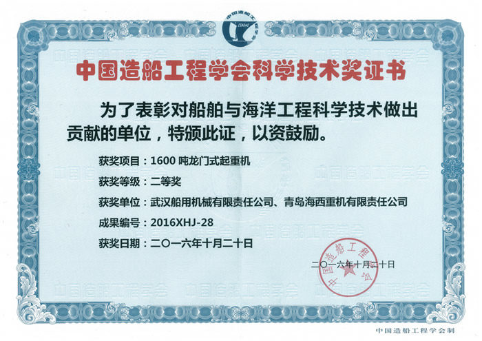近日,中國造船工程學會傳來喜訊,我司《1600噸龍門式起重機》榮獲科學技術(shù)二等獎。這是青島海西重機在船舶與海洋工程領域獲得的又一項具有較高影響力的榮譽。
