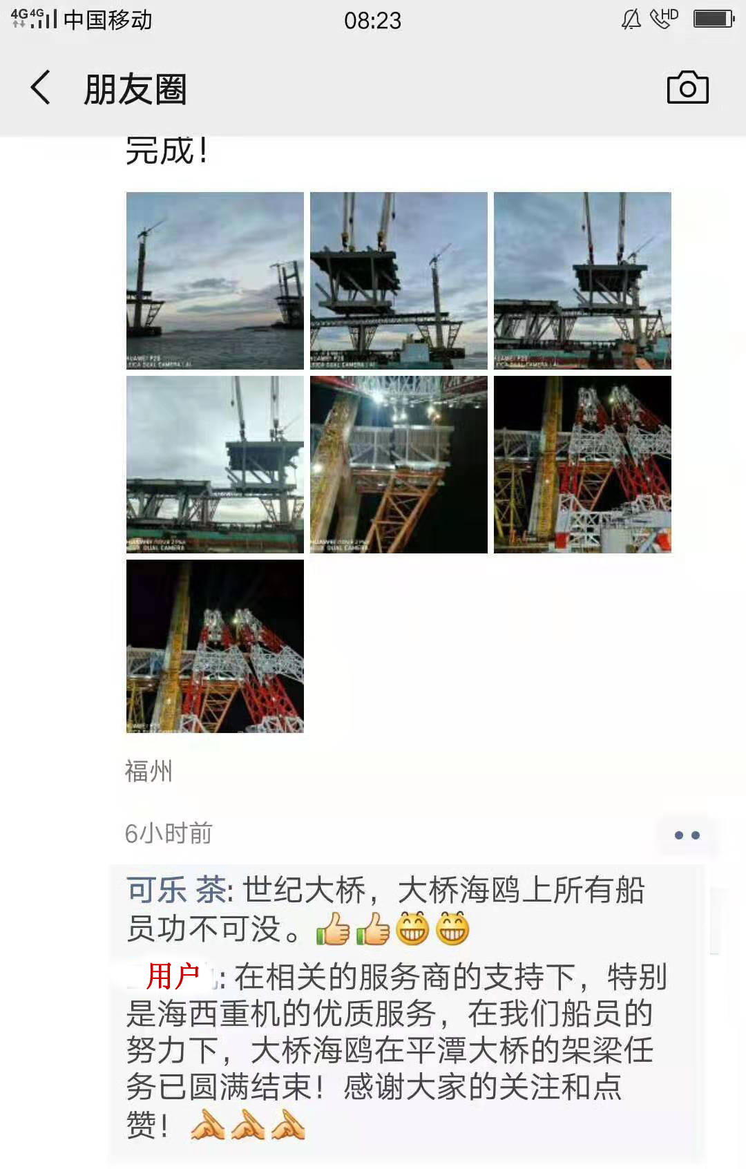 7月28日接到用戶通知,“大橋海鷗號(hào)”將于7月28日晚進(jìn)行第64、65片8鋼梁的架設(shè)(單重達(dá)3200噸),為保證工程順利實(shí)施,請海西重機(jī)安排技術(shù)人員進(jìn)行保駕護(hù)航,用船長的話就是“你們在現(xiàn)場,感到心里踏實(shí)”。公司當(dāng)即安排附近正在羅源灣碼頭做電控系統(tǒng)改造的宋靖浩工程師,前往現(xiàn)場。7月2900日傍晚5點(diǎn),吊裝正式開始,各崗位人員各負(fù)其責(zé),密切配合。直到凌晨時(shí)分,2片鋼梁順利架設(shè)完成,設(shè)備運(yùn)行一切正常,用戶對海西重機(jī)設(shè)備的穩(wěn)定性和服務(wù)的及時(shí)性給予了高度評價(jià)。至8月6日,平潭海峽公鐵大橋,最后一片鋼梁順利架設(shè)完成, “大橋海鷗號(hào)”不辱使命,圓滿完成任務(wù)。用戶喜悅的表揚(yáng),就是對我們優(yōu)質(zhì)服務(wù)的認(rèn)可和正反饋。