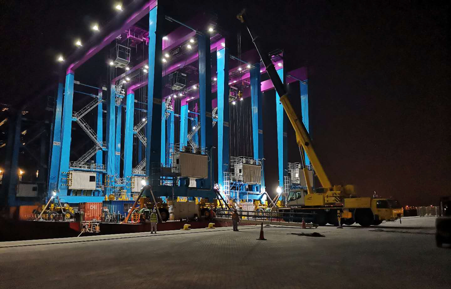 而在7月末發(fā)運(yùn)的第一批12臺(tái)40T輪胎吊經(jīng)過(guò)1個(gè)月的航行到港后,9月初順利完成卸船,擁入新哈馬德港的懷抱。由于業(yè)主方的高層對(duì)該項(xiàng)目高度重視,碼頭方有關(guān)人員還在碼頭舉行儀式迎接設(shè)備抵港并全程航拍錄像。因項(xiàng)目整體施工策劃得當(dāng)、安全高效,疫情防控和設(shè)備調(diào)試并駕齊驅(qū)兩不誤,“海西重機(jī)”再一次贏得了業(yè)主的稱贊。