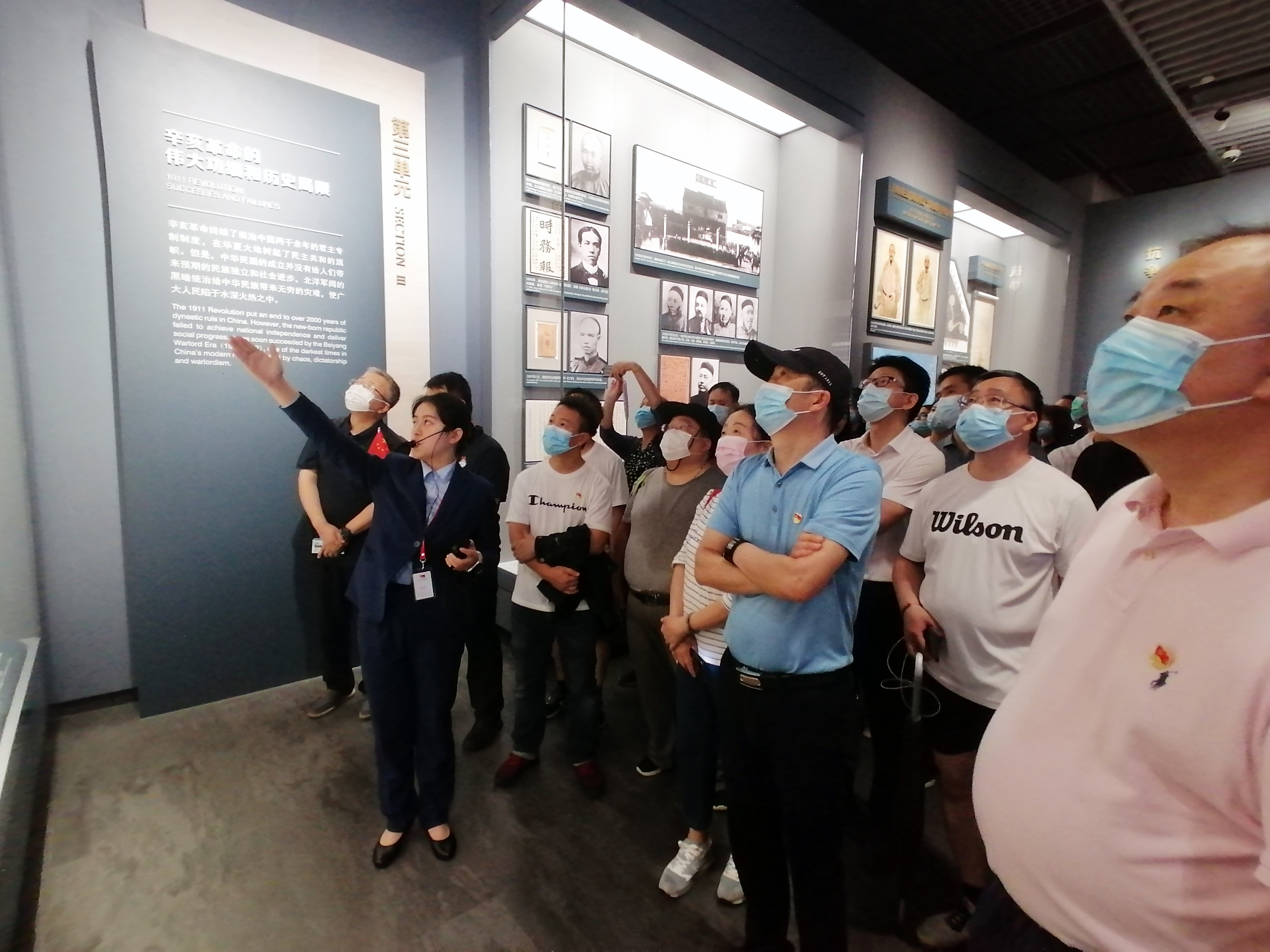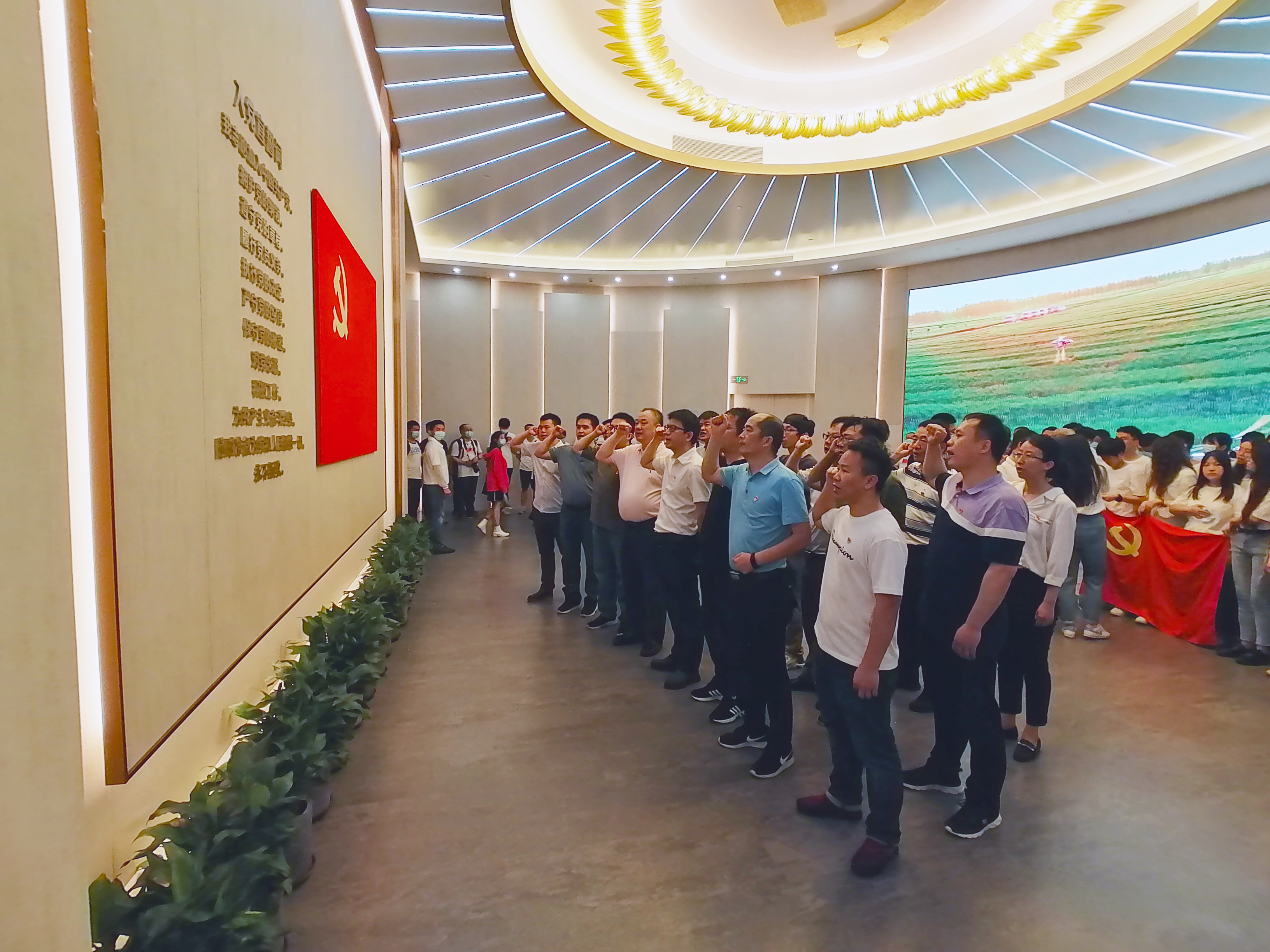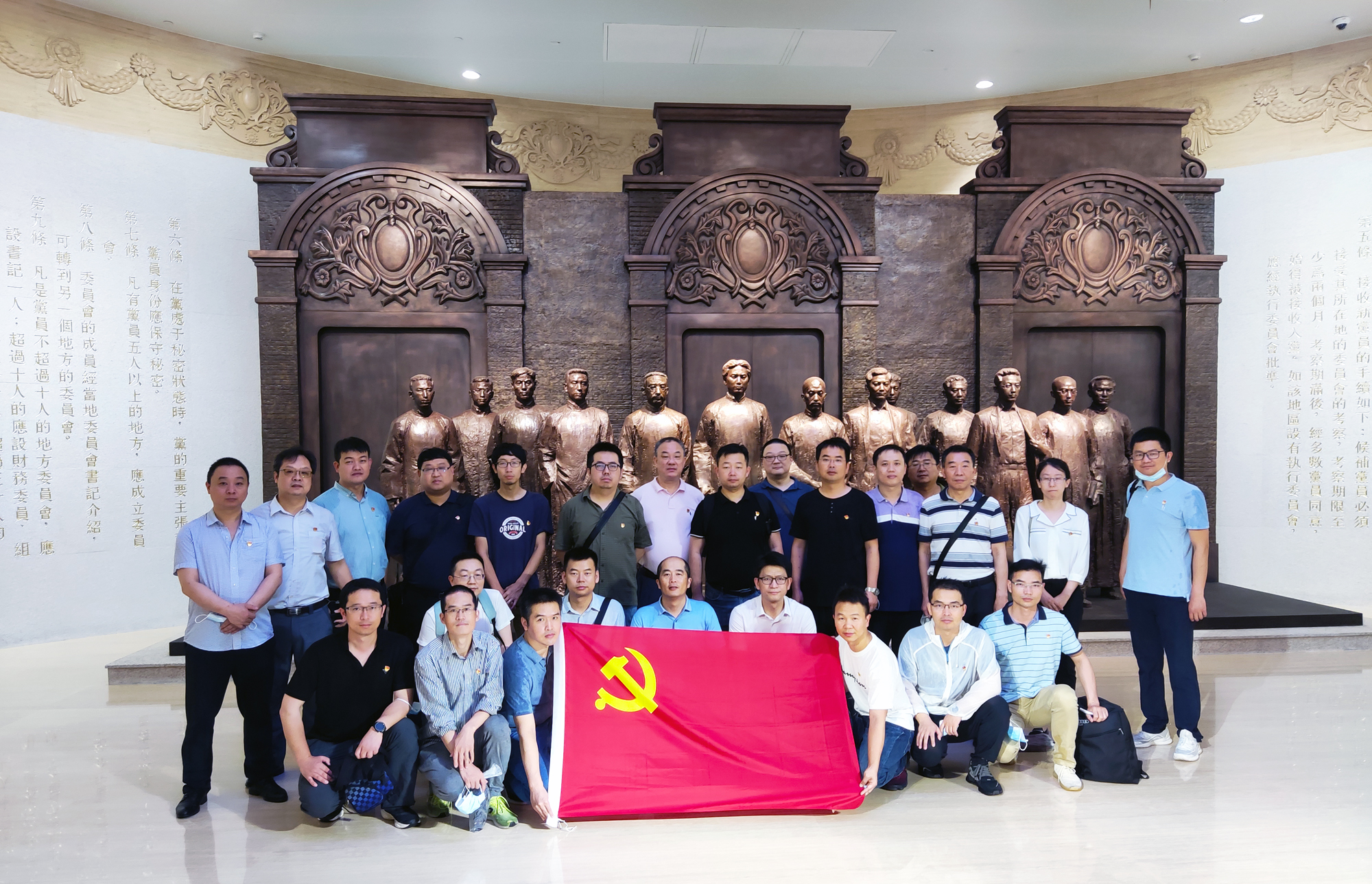 走進(jìn)紀(jì)念館,映入眼簾的是一個(gè)巨幅瓷板畫《日出東方——從石庫門到天安門》,畫面中容納了一大會址、紅船、井岡山、北京天安門等革命圣地元素,反映了中國共產(chǎn)黨由小到大、由弱到強(qiáng)的奮斗歷程。進(jìn)入序廳,迎接參觀者的是主題雕塑《偉大的開端》,13位一大代表站在石庫門前,向我們展示著他們的堅(jiān)定信念和激昂的革命情懷。跟隨講解員,沿著展區(qū)布景的脈絡(luò)一路參觀了“前仆后繼、救亡圖存”,“民眾覺醒、主義抉擇”,“早期組織、星火初燃”,“開天辟地、日出東方”,“砥礪前行、光輝歷程”五個(gè)部分,展廳集中呈現(xiàn)了建黨時(shí)期的珍貴文獻(xiàn)、照片、實(shí)物,并以數(shù)字化、智能化的方式,立體重現(xiàn)了中國共產(chǎn)黨建黨初期在上海的革命實(shí)踐。大家在銘刻歷史印記的文物實(shí)物,內(nèi)容詳實(shí)的刊物、圖片、圖表前駐足,在視頻影像和場景還原處停留,仔細(xì)聆聽講解,用心感悟、感知中國共產(chǎn)黨在上海創(chuàng)建的光榮歷史、奮斗歷程。最后,在宣誓大廳,面對鮮紅的黨旗,朱聲凱帶領(lǐng)大家宣誓,一起重溫入黨誓詞。