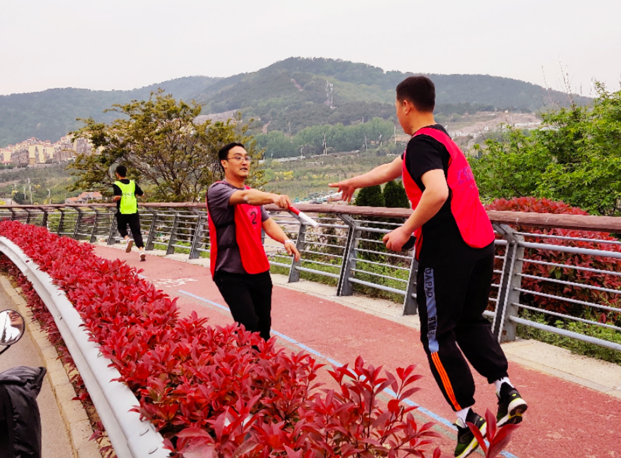 上午八點四十分,參賽選手早早來到起點熱身區(qū),第二、三、四棒運動員也前往接力區(qū)就位。大家服裝整齊、精神飽滿、神采奕奕,一起做著跑前熱身運動,防止肌肉拉傷。選手們紛紛“摩拳擦掌”,準(zhǔn)備來一場“速度與激情”的比拼。場邊觀戰(zhàn)的加油團(tuán),也在為自己支持的隊伍鼓勁兒:“加油!我們得贏在起跑線,來個開門紅!”九點鐘,隨著一聲發(fā)令槍響,第一棒的選手們迅速進(jìn)入狀態(tài),以飽滿的熱情、昂揚的斗志,從起跑線飛奔而出。五月的東環(huán)島路氣候宜人,郁郁蔥蔥,參賽選手們奮力奔跑的身影為水秀山明的畫卷平添了一抹靈動色彩。