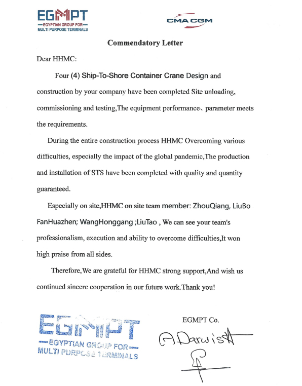 亞歷山大港多用途碼頭為埃及國(guó)家重點(diǎn)項(xiàng)目,埃及國(guó)家領(lǐng)導(dǎo)人員高度關(guān)注該項(xiàng)目進(jìn)展。岸橋到達(dá)用戶碼頭后,項(xiàng)目組嚴(yán)格按照策劃節(jié)點(diǎn)穩(wěn)步推進(jìn)每天工作,確保當(dāng)日事當(dāng)日畢,最終在整個(gè)項(xiàng)目組通力協(xié)作以及用戶的積極配合支持下,岸橋順利完成交付,并按計(jì)劃進(jìn)入保產(chǎn)。期間,埃及總理、交通部部長(zhǎng)對(duì)海西重機(jī)產(chǎn)品及現(xiàn)場(chǎng)項(xiàng)目團(tuán)隊(duì)給予了充分肯定,多家當(dāng)?shù)孛襟w對(duì)此進(jìn)行了專(zhuān)題報(bào)道。用戶特地向我司發(fā)來(lái)一封表?yè)P(yáng)信以示感謝。