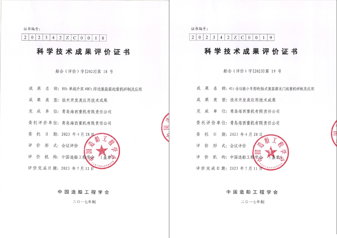 近日,中國船舶集團旗下武漢船機海西重機公司“80t單起升雙40ft岸邊集裝箱起重機研制及應用”、“41t全功能小車型輪胎式集裝箱龍門起重機研制及應用”兩項科技成果通過中國造船工程學會科學技術成果評價,與會專家一致認為,整體技術水平達到國際先進水平。