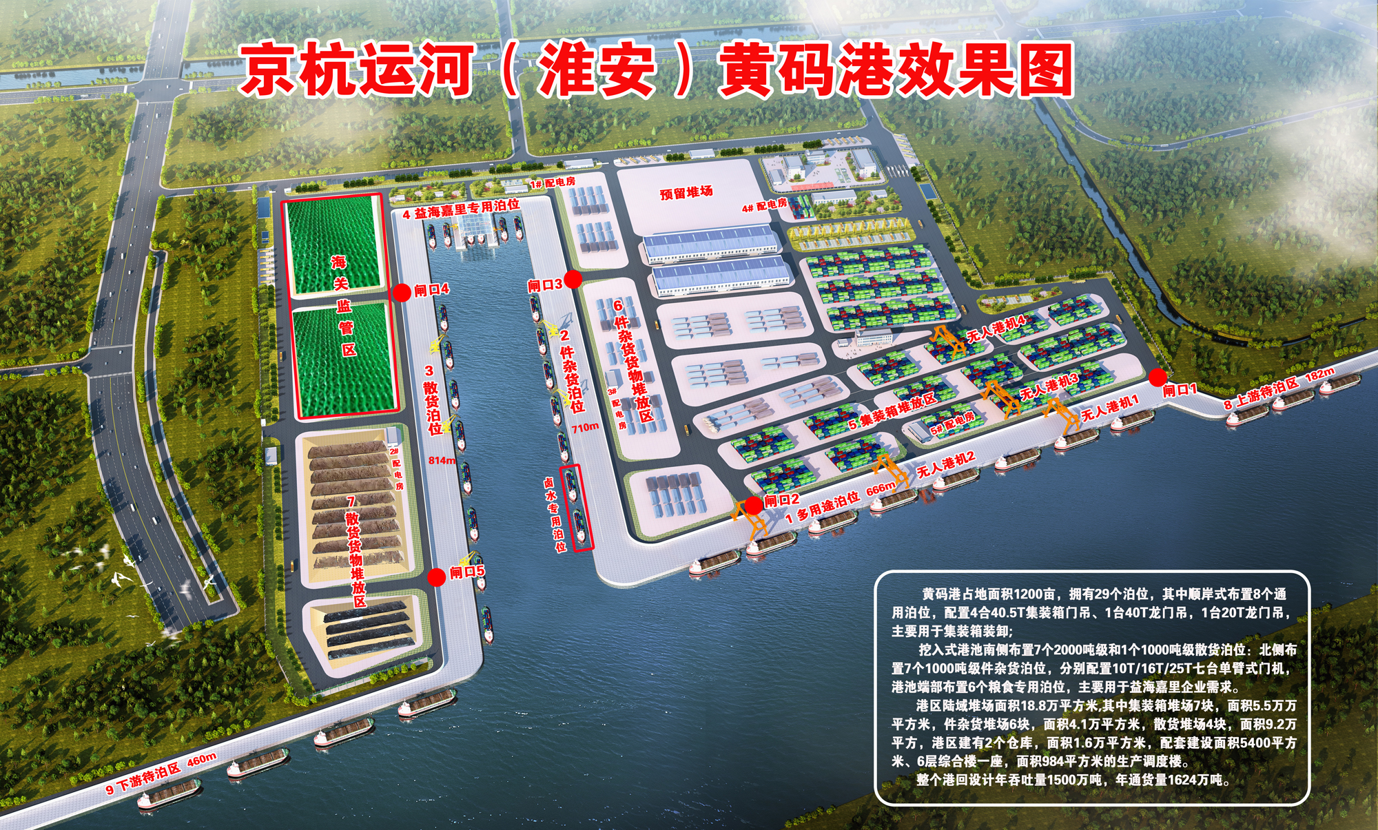 據(jù)了解,黃碼港位于京杭大運(yùn)河和淮河入海水道交匯處,處于京杭運(yùn)河蘇北段的中心,是通江達(dá)海、貫通南北的重要樞紐,是名副其實(shí)的“水上立交”。黃碼作業(yè)區(qū)項(xiàng)目規(guī)劃有29個(gè)千噸級裝卸泊位,可實(shí)現(xiàn)吞吐能力1650萬噸,是京杭運(yùn)河沿線單體投資最大、泊位最多的港口,建成后將成為京杭運(yùn)河主航道沿線重要的現(xiàn)代化內(nèi)河港口。