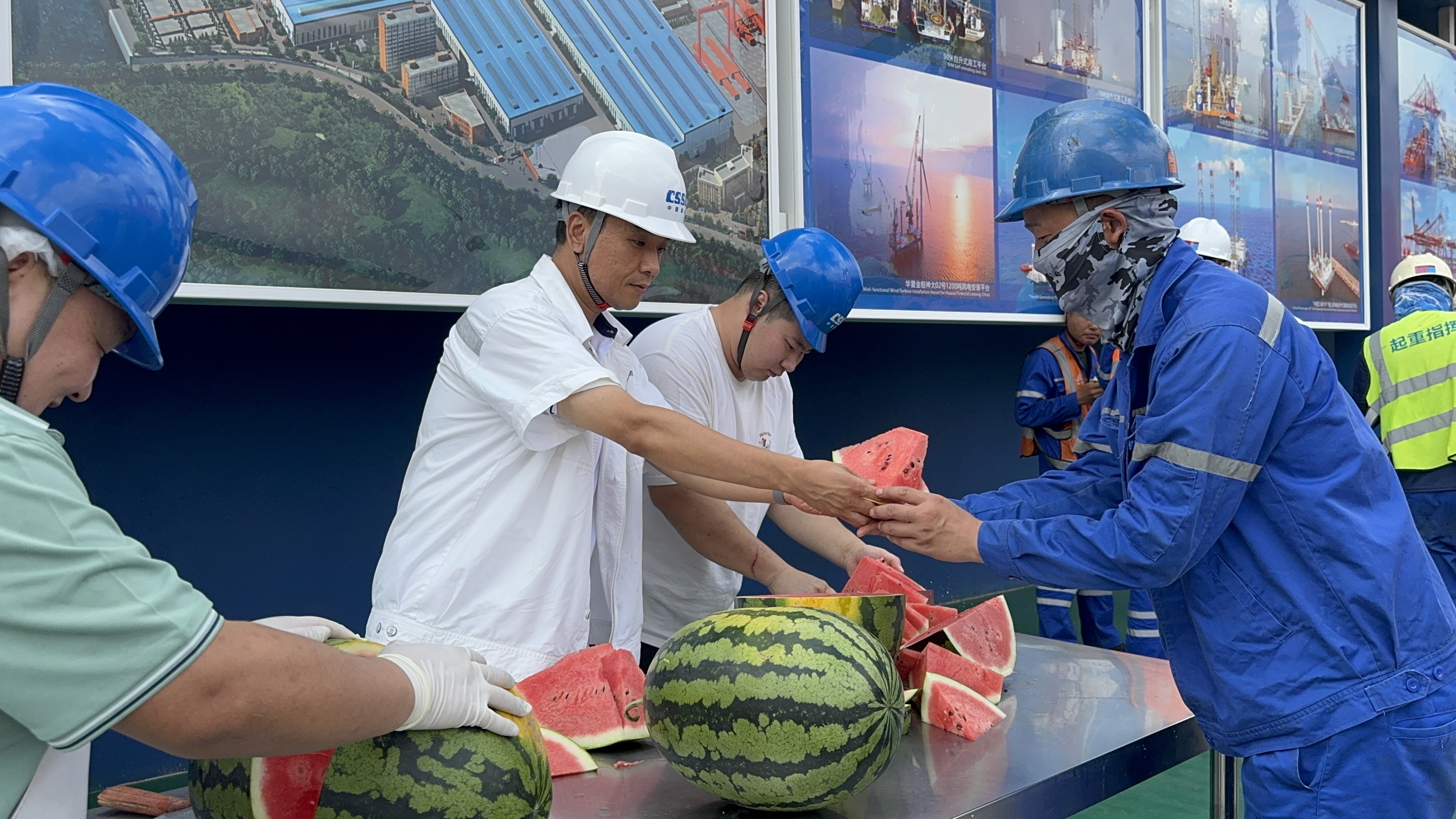 6月份,海西重機(jī)工會(huì)提前啟動(dòng)防暑降溫專(zhuān)項(xiàng)工作,制定詳細(xì)的“送清涼”活動(dòng)實(shí)施方案。自7月初至8月下旬,在廠區(qū)設(shè)立5個(gè)固定“清涼驛站”——新車(chē)間二跨通道、噴砂房、3號(hào)變電站、300噸門(mén)機(jī)作業(yè)區(qū)、港機(jī)部60噸通道,每日供應(yīng)常溫綠豆湯,適時(shí)供應(yīng)西瓜。并針對(duì)戶(hù)外作業(yè)人員,發(fā)放藿香正氣口服液,確保防暑全覆蓋。