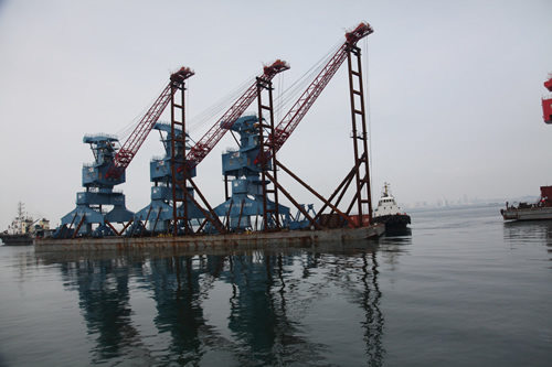 2012年8月17日,3臺(tái)單臂架門座式起重機(jī)(型號(hào):MQ25t-35m)離開我司碼頭,駛向印尼第二港務(wù)集團(tuán)公司。
