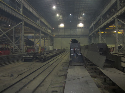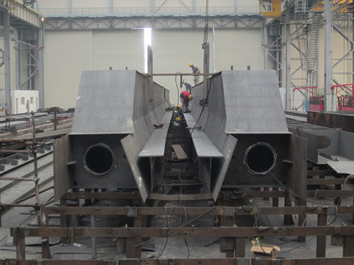 G126為一臺(tái)鹽城大豐港的集裝箱裝卸起重機(jī),該項(xiàng)目13年1月初開工,5月底交付使用,中間要跨越春節(jié),工期異常緊張。為了確保該項(xiàng)目按期交貨,項(xiàng)目部、鋼構(gòu)部、工藝部、品質(zhì)部在項(xiàng)目開工前就進(jìn)行了多次溝通,明確了生產(chǎn)任務(wù)。工藝部總結(jié)以往經(jīng)驗(yàn),并積極采納承制單位建議,優(yōu)化了制作工藝。品質(zhì)部在加強(qiáng)關(guān)鍵點(diǎn)控制的基礎(chǔ)上,明確、簡(jiǎn)化了檢驗(yàn)流程。鋼構(gòu)部按時(shí)間分割生產(chǎn)節(jié)點(diǎn),嚴(yán)控人員及施工進(jìn)度,制定了一系列的保障措施。目前G126項(xiàng)目開工僅半月時(shí)間,所有箱體結(jié)構(gòu)均已裝配成形,部分構(gòu)件如門框上橫梁已處于完工報(bào)檢階段,施工難度相對(duì)較大的前、后大梁已開始承軌梁裝配作業(yè)。施工進(jìn)度基本處于計(jì)劃控制范圍。