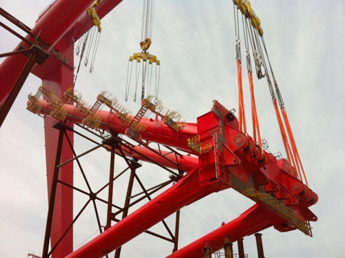 經(jīng)過(guò)一天的準(zhǔn)備,整個(gè)人字架翻身過(guò)程有條不紊:起鉤、落鉤、制動(dòng)、割余量,再起鉤、落鉤、翻身、加固、摘鉤,一氣呵成。在1600T龍門吊上下小車配合下,在我部統(tǒng)籌指揮下,各部門協(xié)同作戰(zhàn),歷時(shí)僅4小時(shí),500T人字架順利翻身,1600T龍門吊投產(chǎn)以來(lái)首戰(zhàn)告捷。
