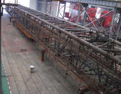500T全回轉(zhuǎn)固定吊臂架長110米,寬6.5米,高5米,重達(dá)200余噸。自接到生產(chǎn)任務(wù)以來,針對(duì)該項(xiàng)目生產(chǎn)任務(wù)緊、制作周期短、難度大等特性,鋼構(gòu)部統(tǒng)籌部署,多管齊下,確保項(xiàng)目進(jìn)展。首先以節(jié)點(diǎn)實(shí)現(xiàn)率為重點(diǎn),細(xì)化施工隊(duì)、焊工隊(duì)節(jié)點(diǎn)考核,嚴(yán)格執(zhí)行;其次考慮技術(shù)熟練程度和連續(xù)性,所有施工及管理人員均采用3600T浮吊臂架原班人馬,各工種24小時(shí)不間斷作業(yè),全力推進(jìn)項(xiàng)目進(jìn)展;第三各負(fù)責(zé)調(diào)度、檢驗(yàn)人員、工藝人員等各司其職、齊心協(xié)力,監(jiān)管措施到位,工序銜接順暢,確保臂架各分支計(jì)劃穩(wěn)步推進(jìn)。在各項(xiàng)有效措施的保障下,在工藝部和品質(zhì)部的全力配合下,該臂架制作歷時(shí)不到40天,制作周期較同類型吊臂架縮短了一倍以上,且一次探傷合格率達(dá)98.5%,結(jié)構(gòu)質(zhì)量和外觀成型得到了業(yè)主的一致認(rèn)可和表揚(yáng),創(chuàng)造了鋼構(gòu)部制作行架結(jié)構(gòu)件的奇跡!